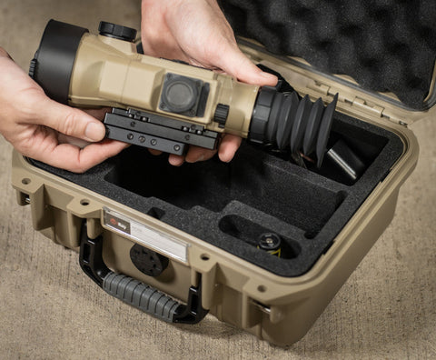 The durable magnesium alloy housing, Cerakote® H-235 tan finish, and IP67 waterproof rating ensure reliability in tough conditions. The unit includes a DLOC Precision Picatinny rail mount which offers a solid lock-up and repeatable return-to-zero performance.